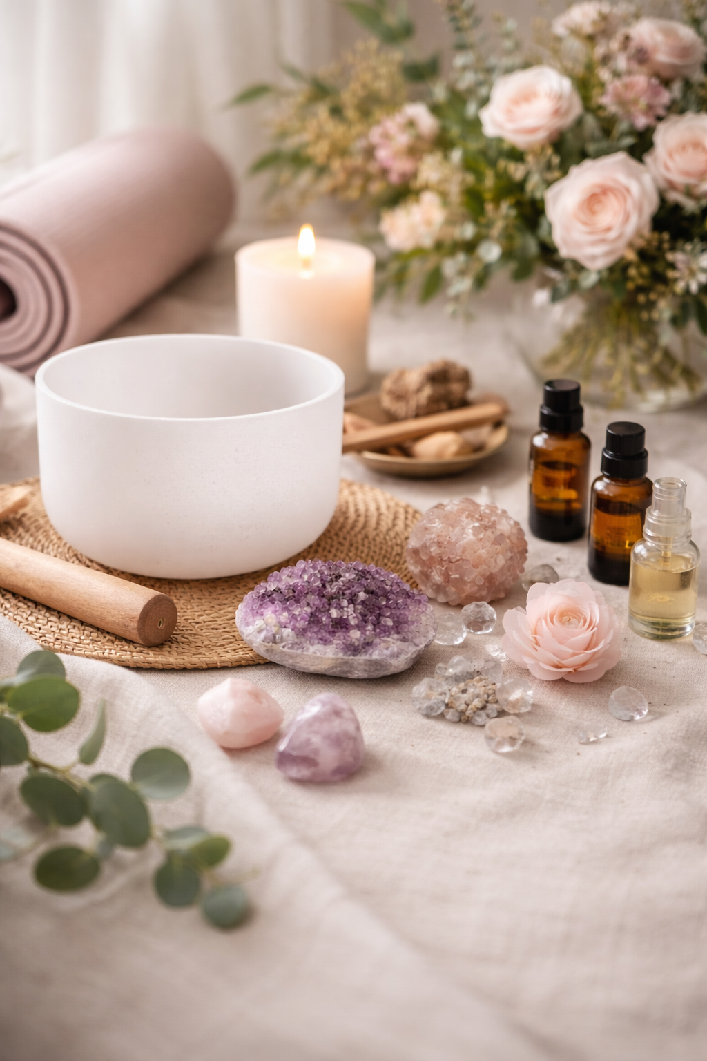 Immersive sound experiences using crystal bowls and vibration to calm the nervous system, support emotional release, and invite deep rest.